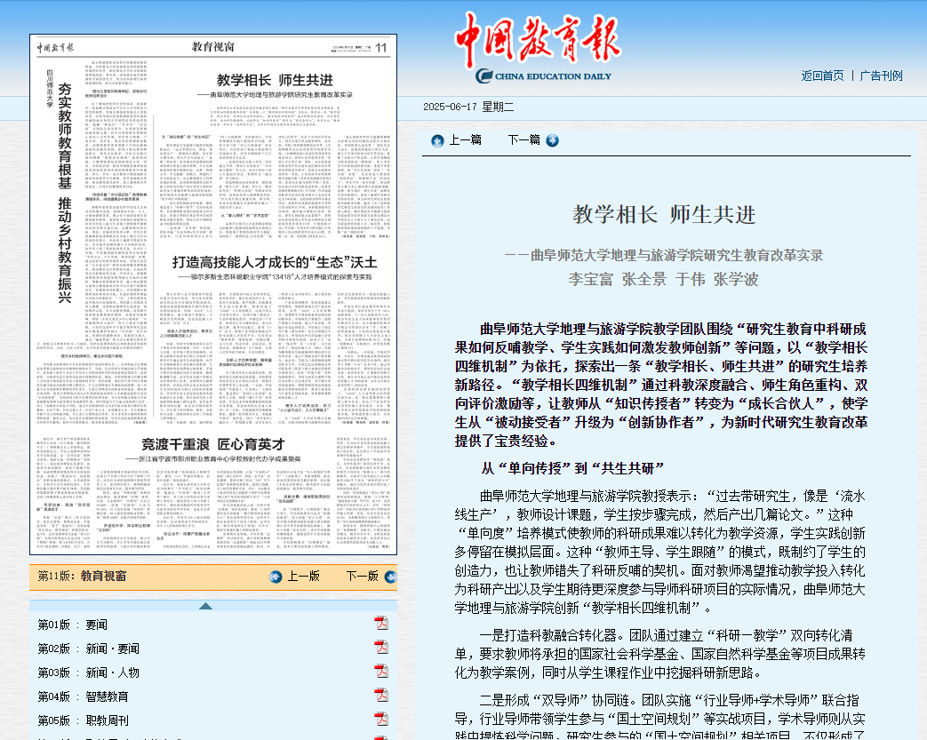 完美体育(中国)官方网站地理与旅游学院教学团队围绕“研究生教育中科研成果如何反哺教学、学生实践如何激发教师创新”等问题,以“教学相长四维机制”为依托,探索出一条“教学相长、师生共进”的研究生培养新路径。“教学相长四维机制”通过科教深度融合、师生角色重构、双向评价激励等,让教师从“知识传授者”转变为“成长合伙人”,使学生从“被动接受者”升级为“创新协作者”,为新时代研究生教育改革提供了宝贵经验。