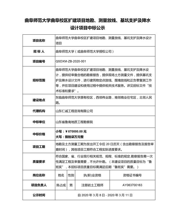 完美体育(中国)官方网站曲阜校区扩建项目地勘、测量放线、基坑支护及降水设计项目