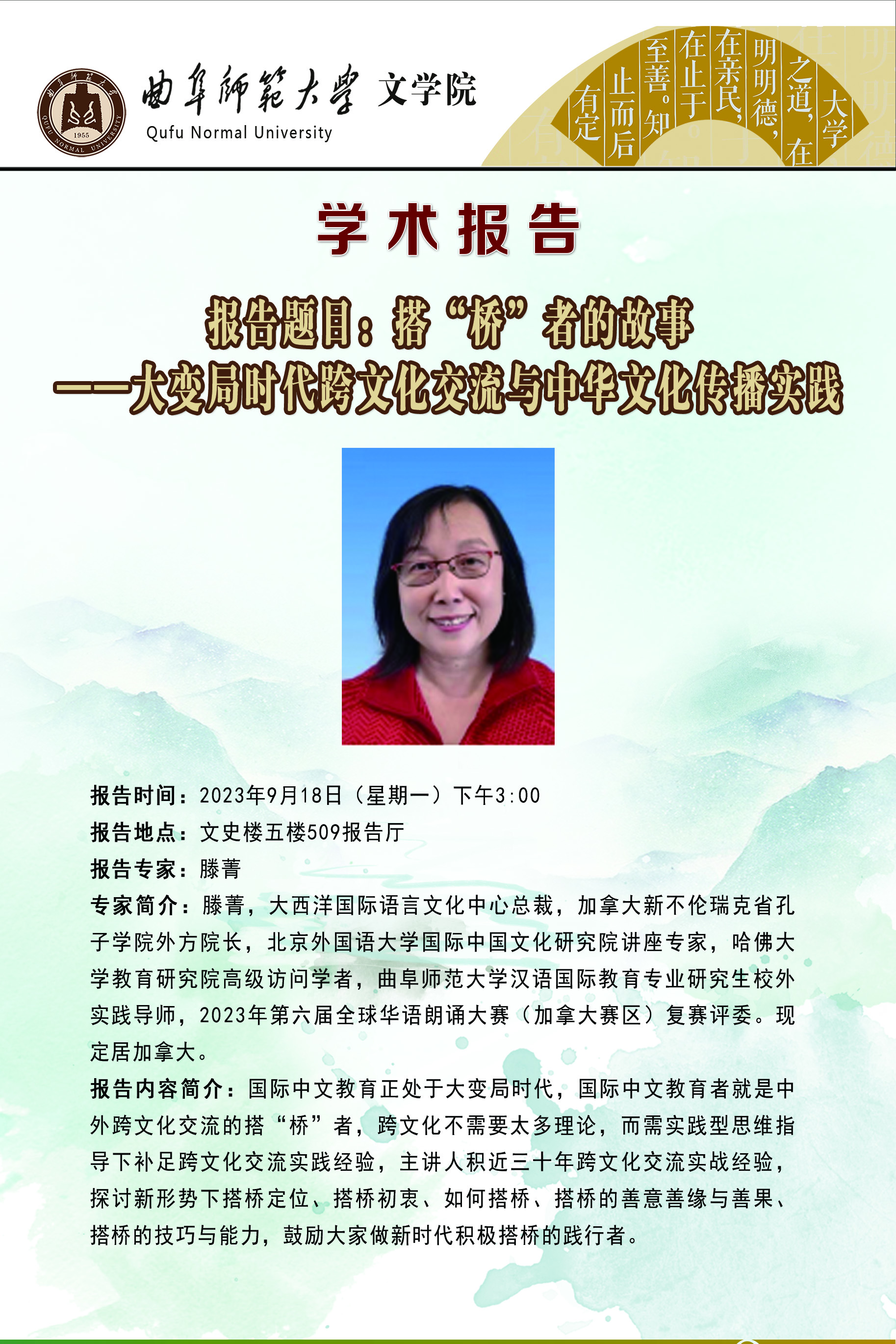 专家简介:滕菁,大西洋国际语言文化中心总裁,北京外国语大学国际中国文化研究院讲座专家,哈佛大学教育研究院高级访问学者,完美体育(中国)官方网站汉语国际教育专业研究生校外实践导师,2023年第六届全球华语朗诵大赛(加拿大赛区)复赛评委。现定居加拿大。