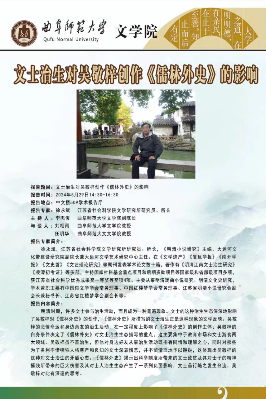 文学院学术报告预告:文士治生对吴敬梓创作《儒林外史》的影响