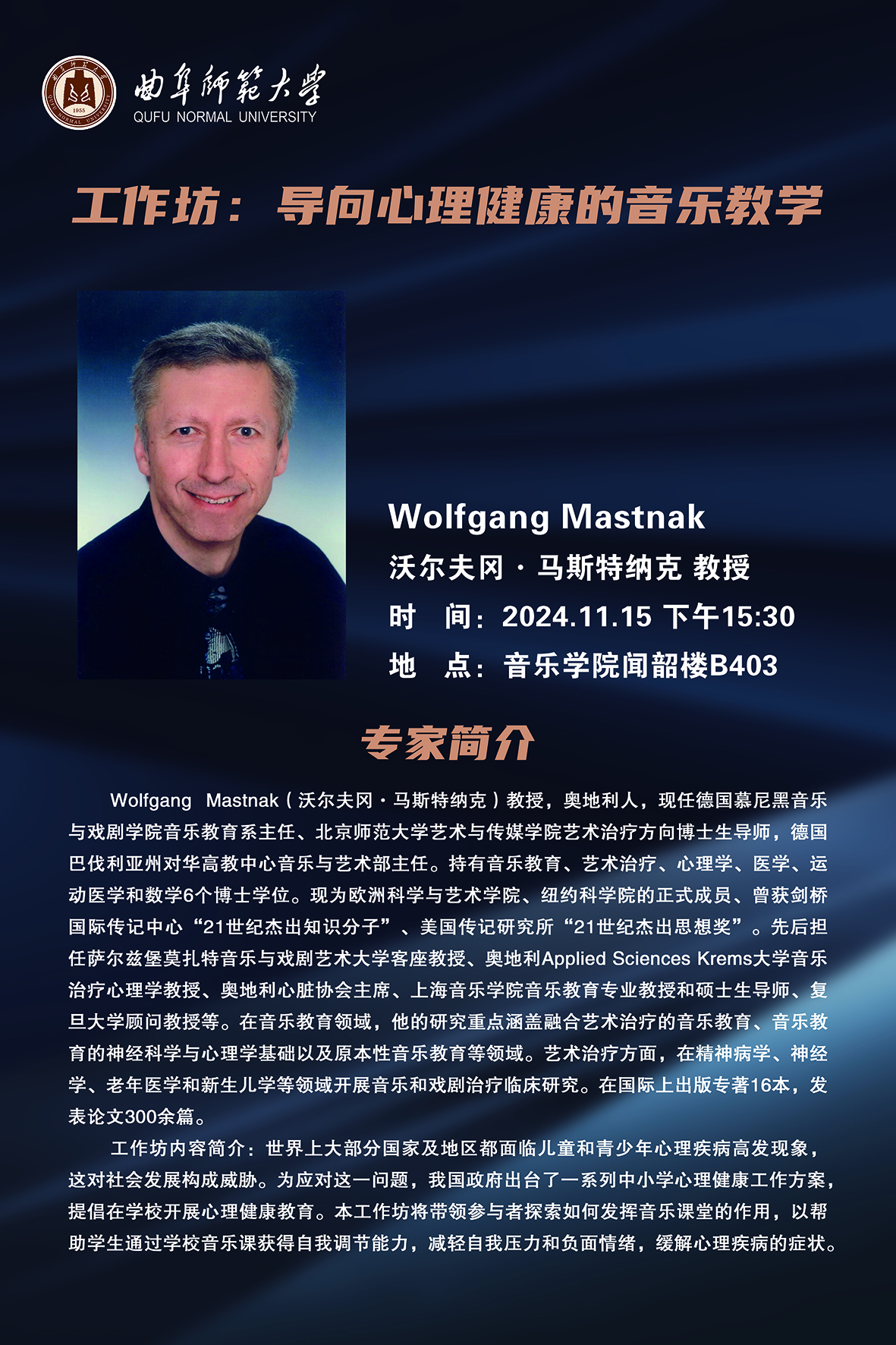 主讲人简介:Wolfgang Mastnak(沃尔夫冈·马斯特纳克)教授,奥地利人,现任德国慕尼黑音乐与戏剧学院音乐教育系主任、北京师范大学艺术与传媒学院艺术治疗方向博士生导师,德国巴伐利亚州对华高教中心音乐与艺术部主任。持有音乐教育、艺术治疗、心理学、医学、运动医学和数学6个博士学位。现为欧洲科学与艺术学院、纽约科学院的正式成员、曾获剑桥国际传记中心“21世纪杰出知识分子”、美国传记研究所“21世纪杰出思想奖”。先后担任萨尔兹堡莫扎特音乐与戏剧艺术大学客座教授、奥地利Applied Sciences Krems大学音乐治疗心理学教授、奥地利心脏协会主席、上海音乐学院音乐教育专业教授和硕士生导师、复旦大学顾问教授等。在音乐教育领域,他的研究重点涵盖融合艺术治疗的音乐教育、跨文化音乐教育、音乐教育的神经科学与心理学基础以及原本性音乐教育等领域。艺术治疗方面,在精神病学、神经学、老年医学和新生儿学等领域开展音乐和戏剧治疗临床研究。在国际上出版专著16本,发表论文300余篇。