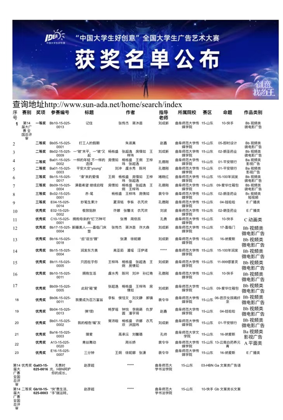 曲阜师大新闻中心讯  近日,第十四届“中国大学生好创意”全国大学生广告艺术大赛获奖名单公布。曲阜师大传媒学子在本次大赛中表现优异,获得全国一等奖1项、二等奖4项、三等奖4项、优秀奖14项,获得等级与数量再创历史新高。