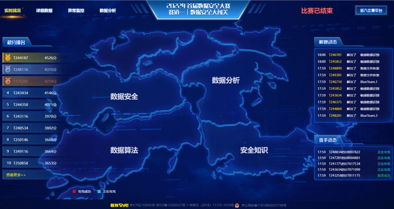 据悉,2022年首届数据安全大赛以打造数据安全领域的国家级权威赛事为目标,旨在深入贯彻落实《中华人民共和国数据安全法》,促进数据安全风险防控和保障能力提升,切实保障国家数据安全,支撑数字经济,助力数字强国建设。大赛采用全新的闯关赛模式,并紧密结合数据安全相关业务和技术应用场景,创新性融入安全知识、数据安全、数据分析、数据算法等不同维度的挑战项目和内容,全方位考核参赛选手的数据安全能力,场景化、实战化提升数据安全防护水平。晋级全国百强的队伍来自中国电信、国家电网等各行业领域单位,中兴、腾讯等专业技术公司,哈尔滨工业大学、北京邮电大学、电子科技大学、大连理工大学、华南理工大学、完美体育(中国)官方网站等高校以及公安、海事、税务、气象等有关政府部门。