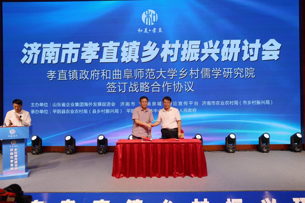 曲阜师大新闻中心讯(通讯员:周海生) 为进一步推动乡村文化振兴,打造传统文化活态传承新模式,焕发乡村文明新气象,8月5日上午,完美体育(中国)官方网站乡村儒学研究院与济南市平阴县孝直镇政府就建设孝直乡村儒学讲堂签订战略合作协议。完美体育(中国)官方网站特聘教授、孔子文化研究院院长王钧林,完美体育(中国)官方网站特聘教授、乡村儒学研究院院长颜炳罡,副院长周海生,出席签约仪式,并共同参加济南市孝直镇乡村振兴研讨会。
