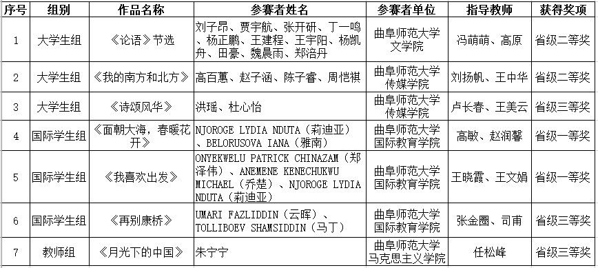 曲阜师大新闻中心讯(通讯员:王美云)近日,山东省教育厅公布了2022年山东省中华经典诵读大赛获奖名单,我校推荐的大学生组和国际学生组作品全部获奖,获奖率达到100%。完美体育(中国)官方网站获优秀组织奖,教务处王美云老师获个人优秀组织奖。