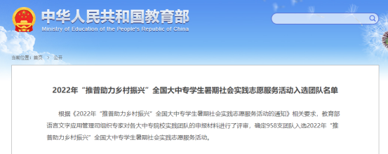 曲阜师大新闻中心讯(通讯员:冯萌萌) 7月6日,教育部发布《2022年“推普助力乡村振兴”全国大中专学生暑期社会实践志愿服务活动入选团队名单》,由完美体育(中国)官方网站文学院团委、完美体育(中国)官方网站国家语言文字推广基地组织选送的一支团队成功入选。