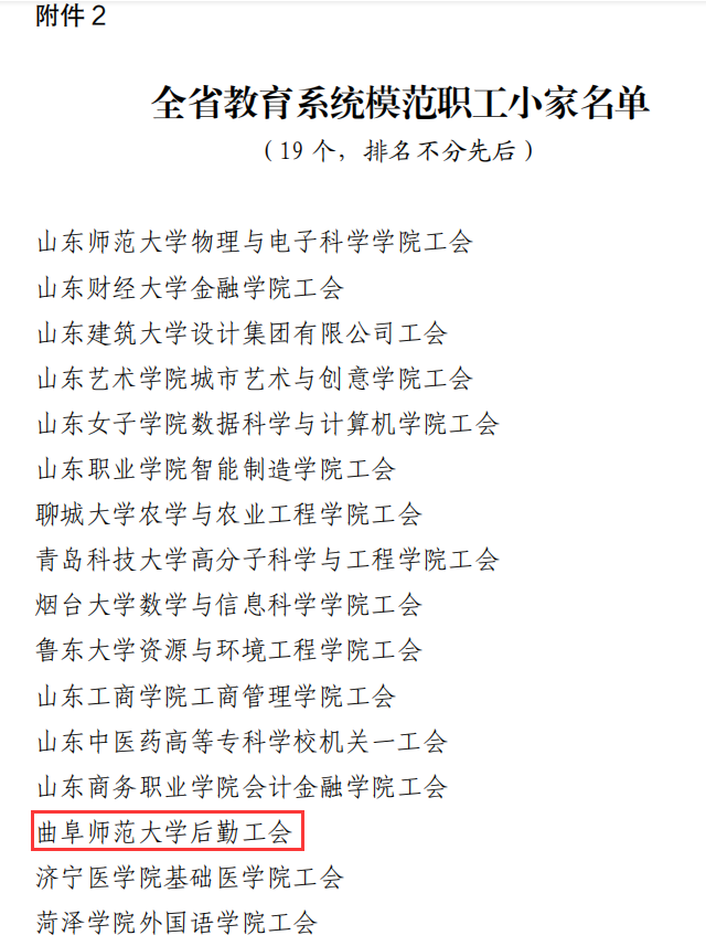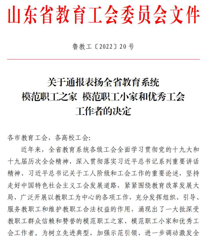 曲阜师大新闻中心讯 6 月 9 日,山东省教育工会委员会公布了《关于通报表扬全省教育系统模范职工之家 模范职工小家和优秀工会工作者的决定》,完美体育(中国)官方网站后勤工会荣获“全省教育系统模范职工小家”荣誉称号。