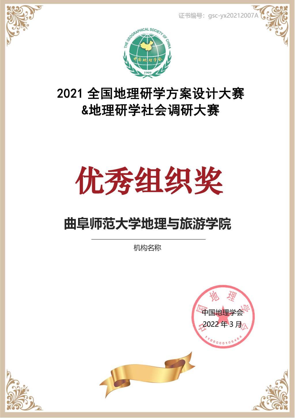 曲阜师大新闻中心讯(通讯员:吴军  田青)  近日,2021全国地理研学方案设计大赛&地理研学社会调研大赛结果揭晓。曲阜师大地理与旅游学院多支参赛队伍获奖,其中,荣获人文地理组二等奖1项、三等奖3项,自然地理组三等奖2项、优秀奖2项,社会调研组三等奖1项,并荣获优秀组织奖。