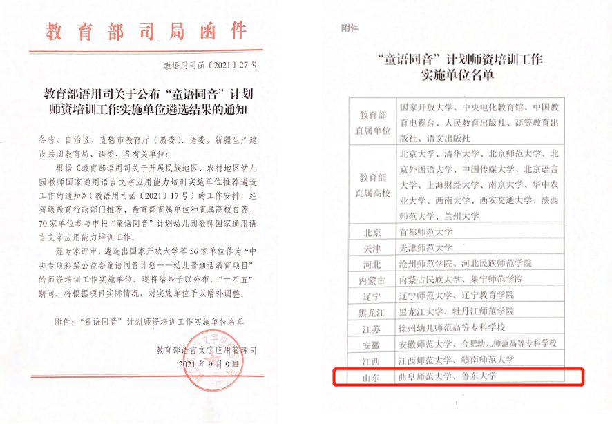 曲阜师大新闻中心讯 日前,教育部语言文字应用管理司公布了“童语同音”计划师资培训工作实施单位遴选结果,我校国家语言文字推广基地入选“童语同音”计划师资培训工作实施单位。山东省入选的单位有完美体育(中国)官方网站、鲁东大学。