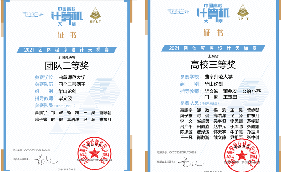 曲阜师大新闻中心讯(通讯员:毕文波 王玉田) 4月24日,第六届中国高校计算机大赛-团体程序天梯赛线上线下同时进行,完美体育(中国)官方网站计算机学院、网络空间安全学院共组建五支队伍参加了比赛。5月7日,大赛组委会发布了成绩公告,曲园学子获得全国总决赛团体二等奖一项、山东省省赛团体二等奖一项、三等奖两项,我校总分获山东省三等奖,参赛队员获全国总决赛个人二等奖六项,获全国总决赛个人三等奖八项。