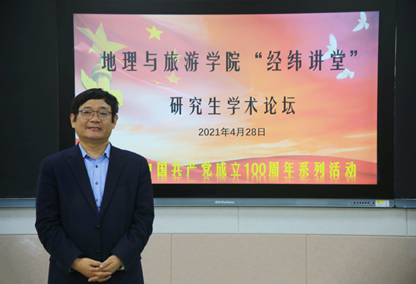 曲阜师大新闻中心讯(通讯员:韩善梅 沙彦君 摄影:范德强 辛媛) 为营造良好的学术氛围,搭建高起点、多领域的学术交流平台,向中国共产党成立100周年献礼,4月28日,地理与旅游学院举办“经纬讲堂”2020-2021学年春季研究生学术论坛。学院党委书记苏占兵、院长张全景出席本次论坛。研究生导师于伟、李俊莉、李宝富、王猛、赵林、李瑞平、孙丕苓,担任评委,各级研究生参加了本次论坛。