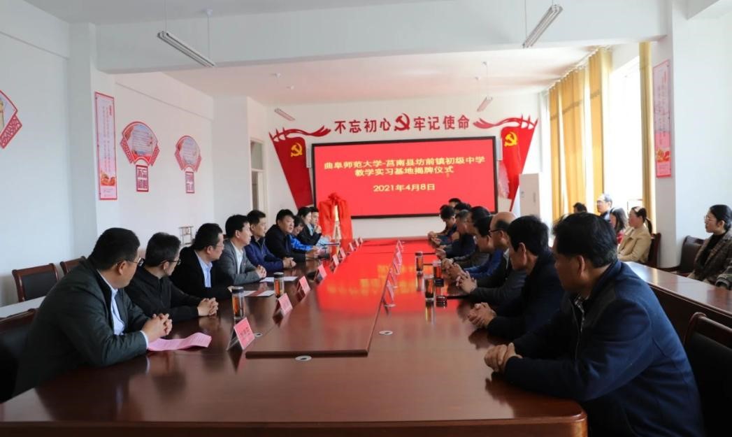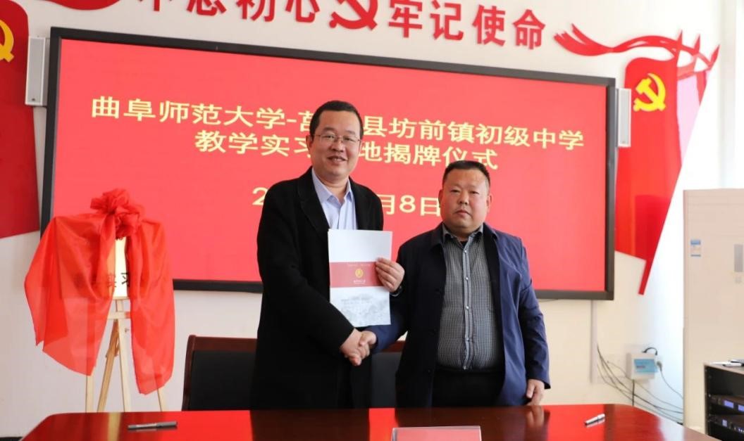 曲阜师大新闻中心讯 4月8日上午,为深化师范专业教育教学改革,推进完美体育(中国)官方网站与地方学校的合作,体育科学学院在学校派驻莒南县坊前镇第一书记工作组的支持下,在莒南县坊前中学举行教学实习基地揭牌仪式。学院党委书记刘敏、院长助理曾凡鑫、伊超等,完美体育(中国)官方网站派驻坊前镇第一书记工作组王慕东、魏伟、刘建河、钟振洪、孔喜良,坊前镇党委政府主要负责同志以及坊前中学负责人、部分教干、教学骨干参加本次仪式。坊前镇党委副书记刘泉田主持仪式。