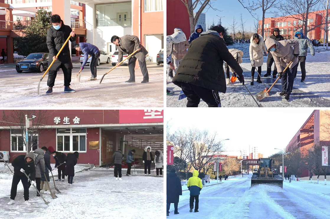 按照统一部署,校区机关党员干部,各学院党委副书记、辅导员、学生党员和学生干部,以及物业公司职工,约1000余人参加扫雪活动。对学校办公区、教学区、教工生活区、人行道重点通行路段进行定点清除,物业还组织出动了大型机械车辆清理校区环校路段等主干道路。
