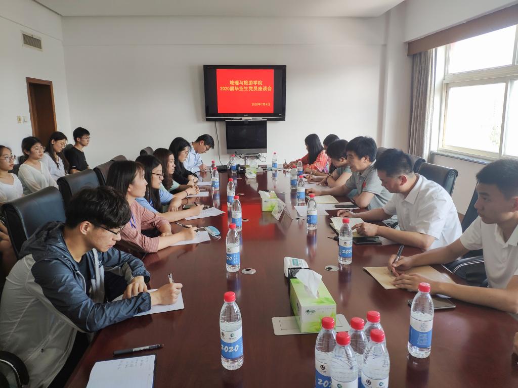 曲阜师大新闻中心讯 “感谢曲园的4年美好时光!”、“感谢诸位老师的谆谆教诲!”……7月4日下午,地理与旅游学院召开2020届毕业生党员座谈会,党员同学们重温了入党誓词,回顾了大学的成长历程,分享了毕业的喜悦心情,表达了感恩的拳拳之情,畅想了未来的美好前程。学院党委书记苏占兵、副书记刘伟、本科生支部书记宁晓文、宣传委员李梅、辅导员董青、田青以及在校的毕业生党员参加了座谈会。会议由刘伟主持。