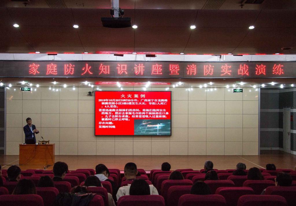 保卫处刘淑朋老师做了题为“家庭防火消防安全知识”讲座。刘老师借助视频、幻灯片等大量的真实火灾案例向大家介绍了家庭发生火灾的原因、火灾存在的隐患、应对火灾的措施,以及家庭用电、用气、防火、扑灭初期火灾和火灾逃生的安全知识。讲座结束后,老师们进行灭火器使用演练和消防水带实际操作。