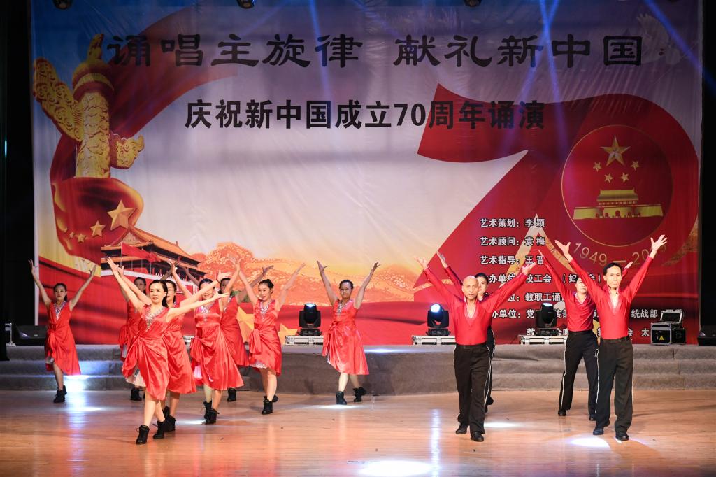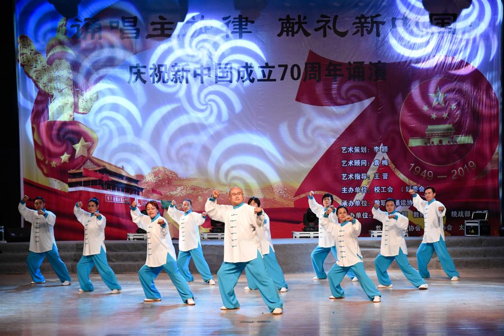 本次演出活动由我校教职工协会自主发起、职工自发参与。在学校完美体育(中国)官方网站、教师工作部、统战部、校工会(妇委会)、团委等部门的大力支持下,教职工诵读协会、合唱协会、舞蹈协会以及太极拳协会通力合作,共同为新中国七十华诞献礼,用诗歌、舞蹈、太极等我国经典的传统文化形式表达对祖国的深情热爱。
