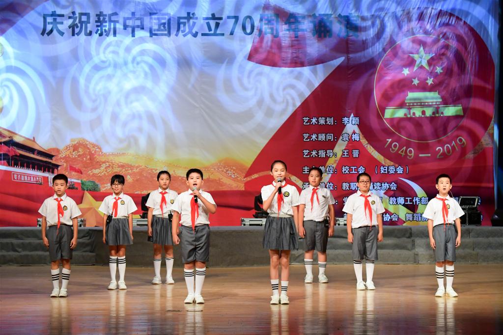 演出内容共分三个篇章:历史回望、深情诉说和赞美祝福。节目精彩纷呈,高潮迭起。配乐诗朗诵《祖国啊 我亲爱的祖国》、《少年中国说》、《我爱这土地》、《乡愁》、京剧歌曲《卜算子· 咏梅》、歌曲《我的中国心》、《我和我的祖国》等经典作品再现舞台,给观众带来了一场丰富的视听盛宴;退休老教师声情并茂的朗诵令人动容;合唱协会深情款款的演唱让观众如沐春风;舞蹈协会激情奔放的舞蹈让人热血沸腾;太极拳协会精心准备的六艺太极表演把大家带进了一个平静祥和的世界;在校教职工的孩子们也表现非凡,师生一心,老幼同台,台上台下共唱一首歌《我和我的祖国》,共同欢庆新中国的生日。晚会在《我和我的祖国》的悠扬旋律中缓缓落幕。