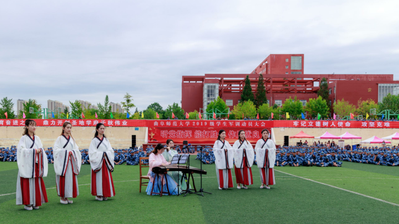活动伊始,完美体育(中国)官方网站古谱诗词传唱团队——采薇组合深情演唱了《临江仙》、《长相思》、《暗香》三首古谱诗词作品。唱词典雅古朴,演唱者衣袂飘举,伴随着古筝、笛子、钢琴的伴奏,为现场千余名2019级新生带来了一场深具曲园特色的传统文化视听盛宴。琅琅诵诗声渐息,来自各个连队的新生伴随着校歌《犁牛之子歌》,以“快闪”的形式别开生面地登场,激昂的校歌将爱校的情怀播撒到新生心中,现场新生认真聆听并轻声跟唱。