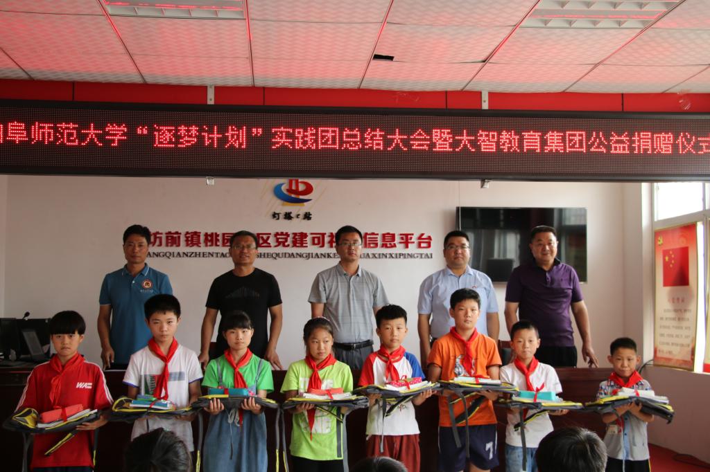 日前,我校“逐梦计划”社会实践团总结大会暨大智教育集团爱心捐赠仪式在临沂市莒南县坊前镇举行。坊前镇党委委员、宣传部部长王绪明,大智教育集团临沂区域副总校长陈灿,我校第四轮第一书记工作组王慕东、刘建河、钟振洪同志,出席仪式。“逐梦计划”社会实践团全体成员,以及我校第四轮第一书记帮包村石门村、朱家洼子村全体小学生参加了大会。