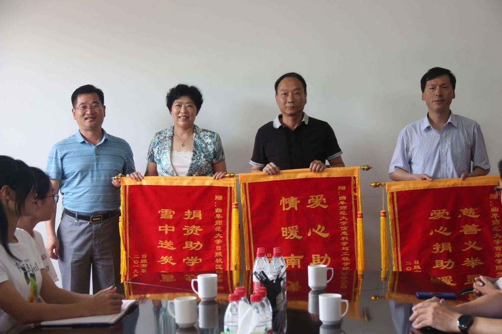座谈会上,肖桂彬代表参加一帮一结对子的党员师生向南湖镇初级中学的学生代表颁发了爱心助学金。南湖镇中心初级中学校长陈金向我校日照校区机关党委、信息科学与工程学院党委、音乐学院党委赠送了锦旗。