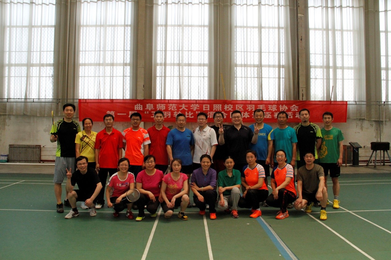 5月19日,日照校区教职工羽毛球协会在球类馆举行基础动作培训暨第一届“五羽轮比”混合团体追逐赛。