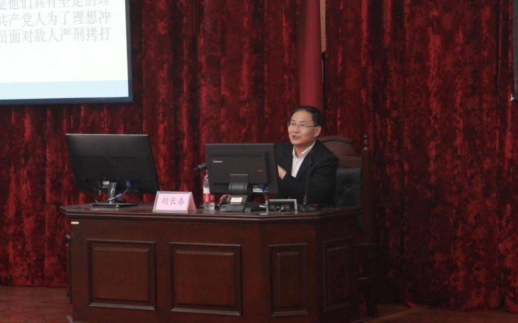仪式结束后,地理与旅游学院党委书记胡长春为法学院党校讲授2018年春季培训班第一课。胡长春旁征博引、深入浅出地阐述了理想信念对于个人成长及一个政党发展、国家发展的重要性和开展理想信念教育的必要性,就如何看待共同理想、怎样树立远大理想等问题进行了解答。