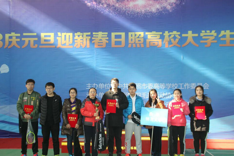 12月23日,庆元旦迎新春日照高校大学生羽毛球比赛在山东水利职业学院体育馆内开幕。本次比赛由日照市委高等学校工作委员会主办,日照市羽毛球运动协会承办。我校代表队在体育教学部杨弢主任的带领、闫允璐教练的指导下荣获团体赛第二名的佳绩,美术学院张宪恒同学获得男单第五名,传媒学院李敏与马克思主义学部李丽同学分别获得女单第三、四名 。