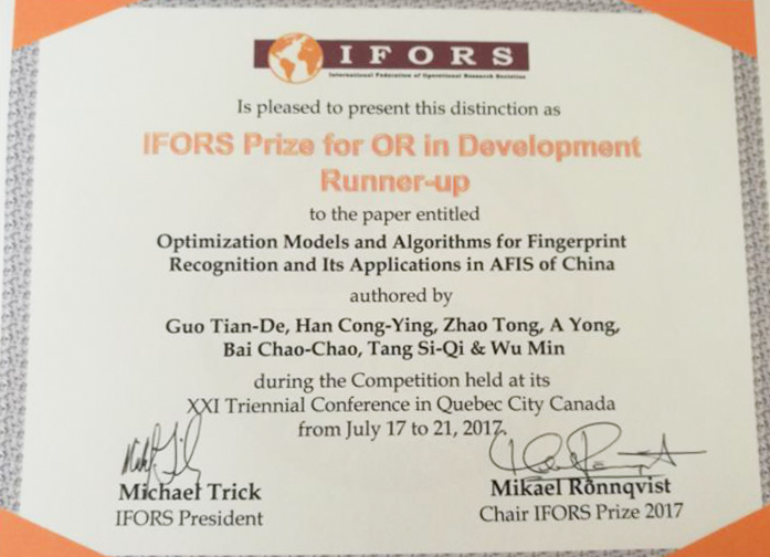 近日,第21届国际运筹学联合会大会(英文缩写IFORS)在加拿大魁北克国际会议中心召开。大会上,我校优秀校友、中国科学院大学郭田德教授团队提交的论文/项目“Optimization Models and Algorithms for Automatic Fingerprint Recognition and Its Applications in AFIS of China”,荣获二等奖。