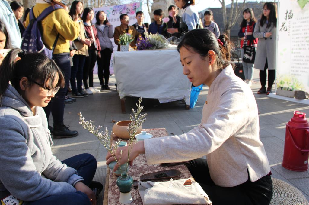 活动现场布置温馨,“情谊筑青春”宣传板上展示了本次活动线上环节——“读你的感觉像春天”闺蜜独照秀与“有你真好”闺蜜合照秀征集的照片,吸引来往同学驻足观看。活动展示体验区设置了“淡中有味茶偏好,清茗一杯情更真”的茶艺;“始于土,成于火,瓷比玉,宁碎不折”的陶艺制作;“一炉香,一缕烟,既可静思,又能洞察梵烟缥缈”的香道展示;“头上花枝照酒卮,酒卮中有好花枝”的插花艺术;一曲悠扬的古筝,一声清脆的竹笛……带领大家走进了一个优雅恬淡的世界,引导在场女生培育高雅淳厚的文化修养,塑造诗意的自己。参与者一起学习茶道、陶艺、插花,一同交谈,微笑挂在脸上,甜蜜留在心中。
