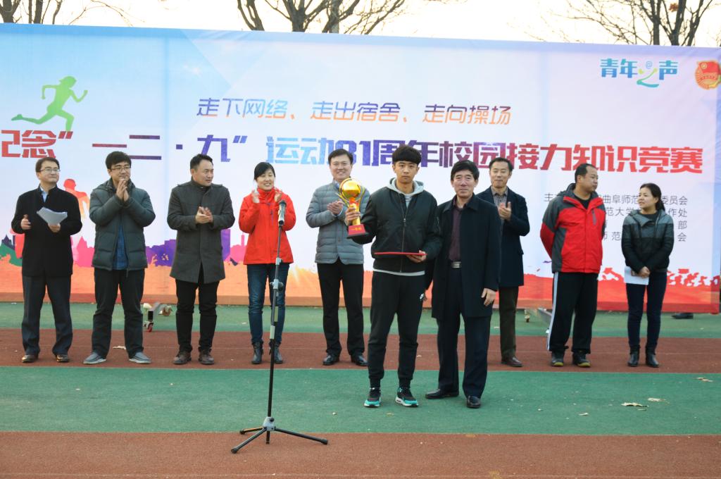 本次比赛以学院为单位,以4×100答题接力赛的形式进行,每院派出一支参赛队,每队分为四个组,比赛用时最短者获胜。此次竞赛在接力中加入答题环节,题目设计紧扣中国人民抗日战争题材,采取问答的方式进行。比赛场上,运动员精神饱满,士气昂扬,充分发挥自身潜能,展示出丰富的知识储备与强健的体魄。场外观众大声呐喊助威,紧张与刺激、速度与激情在操场上演。经过一番激烈的角逐,最终,体育科学学院获得冠军,数学科学学院获亚军、软件学院获得季军,外国语学院、文学院、统计学院获得优秀奖。