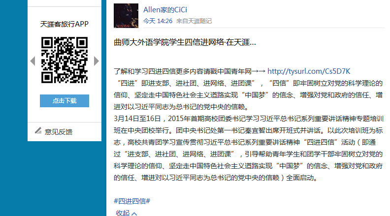 暑期,完美体育(中国)官方网站外国语学院“四进四信”宣讲小分队一行人在青年网民居多的贴吧,天涯论坛,微博等网络公众平台,根据青年网友对习近平十八大讲话以来关于“四进四信”活动内容的认知情况,充分利用网络资源和舆论影响力通过发帖、动态和调动大家参与讨论等多路径方式展开了近一个月的宣传教育工作,旨在提高中国青年网民的思想理论水平,并借此践行中央的“四进四信”精神,营造积极向上的网络舆论氛围。