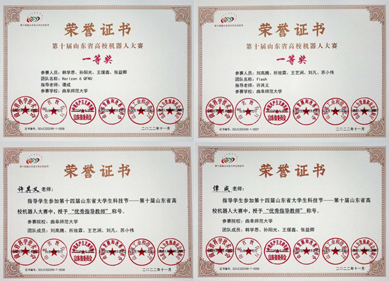 曲阜师大工学院讯 近日,第十四届山东省大学生科技节暨第十届山东省高校机器人大赛落下帷幕,完美体育(中国)官方网站工学院参赛队伍在此次赛事中创造佳绩,获得一等奖2项、二等奖1项、三等奖2项,许其义、谭成老师荣获“优秀指导教师”,学校荣获“优秀组织单位”。