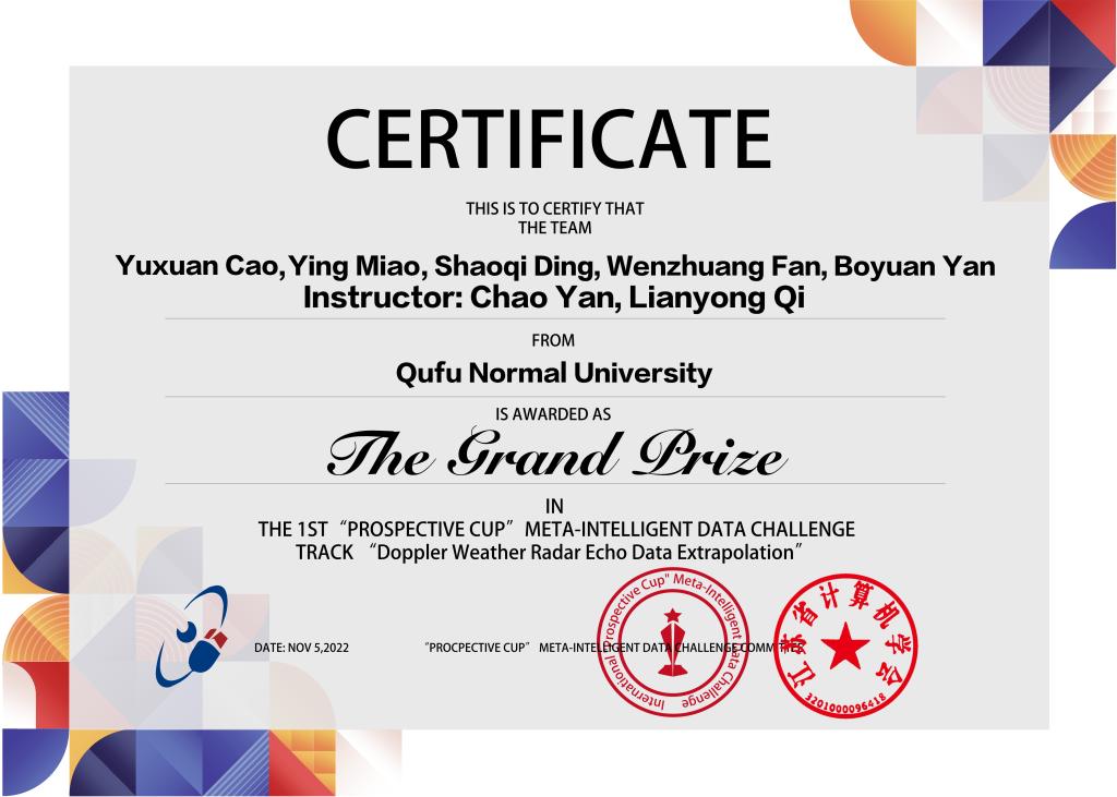 曲阜师大新闻中心讯 近日,由第十二届计算机工程与网络国际会议(CENet2022)发起的首届国际“远见杯”元智能数据挑战大赛(中国科协欧洲(比利时)海智创新创业基地、江苏省计算机学会主办)在海南省海口市落下帷幕。大赛采取赛道制,分为“火灾下混凝土温度孔压时空演化学习”、“音乐驱动的指挥动作生成”、“沉积学知识图谱中实体识别”、“多普勒天气雷达回波数据外推”四个赛道。其中,由完美体育(中国)官方网站计算机学院闫超、齐连永老师指导,曹宇轩、苗影、丁少奇、樊文壮和闫博远等研究生完成的参赛作品:A Doppler Weather Radar Echo Data Extrapolation Model Based on MultiConvARIMA,喜获大赛唯一特等奖(奖金1万元)。