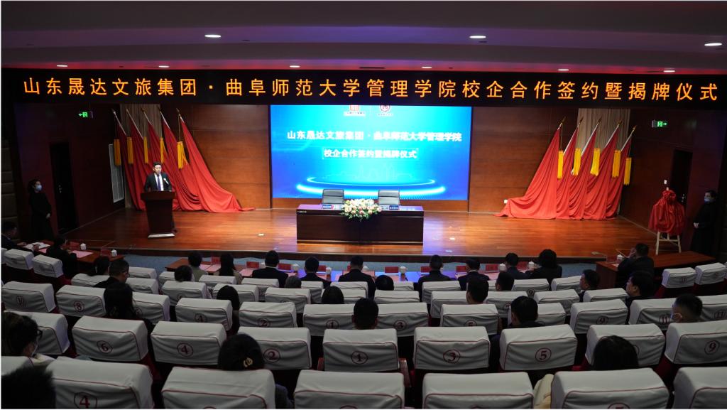 曲阜师大管理学院讯 为加强校企合作交流,探索校企的深度融合模式,充分发挥校企协同育人优势,3月22日,曲阜师大管理学院与山东省晟达文旅集团举行校企合作签约仪式。薛城区政协党组成员、副主席、教体局局长李景东,薛城区文旅局局长李岽苏,薛城区国资局局长褚辉,晟达文旅集团党委书记、董事长韩业海以及管理学院领导班子、教师代表参加本次签约仪式。