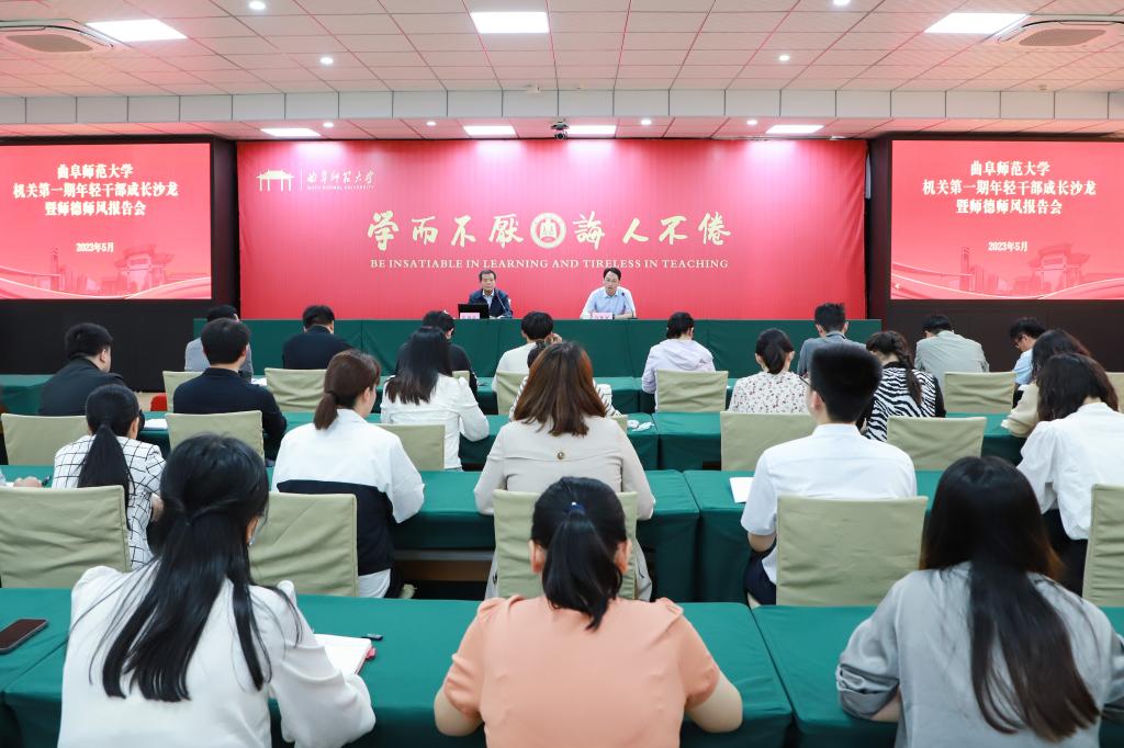 曲阜师大机关党委讯  为扎实推进学习贯彻习近平新时代中国特色社会主义思想主题教育,紧扣以学铸魂、以学增智、以学正风、以学促干下功夫、务实效,5月12日下午,学校机关党委举行年轻干部成长沙龙启动仪式,首期沙龙邀请了全国模范教师、全国高校优秀思想政治理论课教师、齐鲁最美教师张瑞甫教授,为大家作师德师风专题报告。