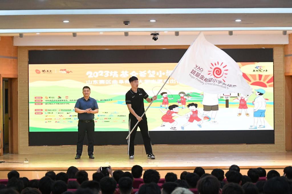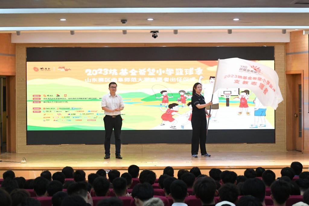 山东省青少年发展基金会资助部部长董晓峰为志愿者代表李柯阳授姚基金希望小学篮球季旗,完美体育(中国)官方网站团委书记孔轶众为志愿者代表马蔓妮授姚基金希望小学篮球季支教志愿者旗。