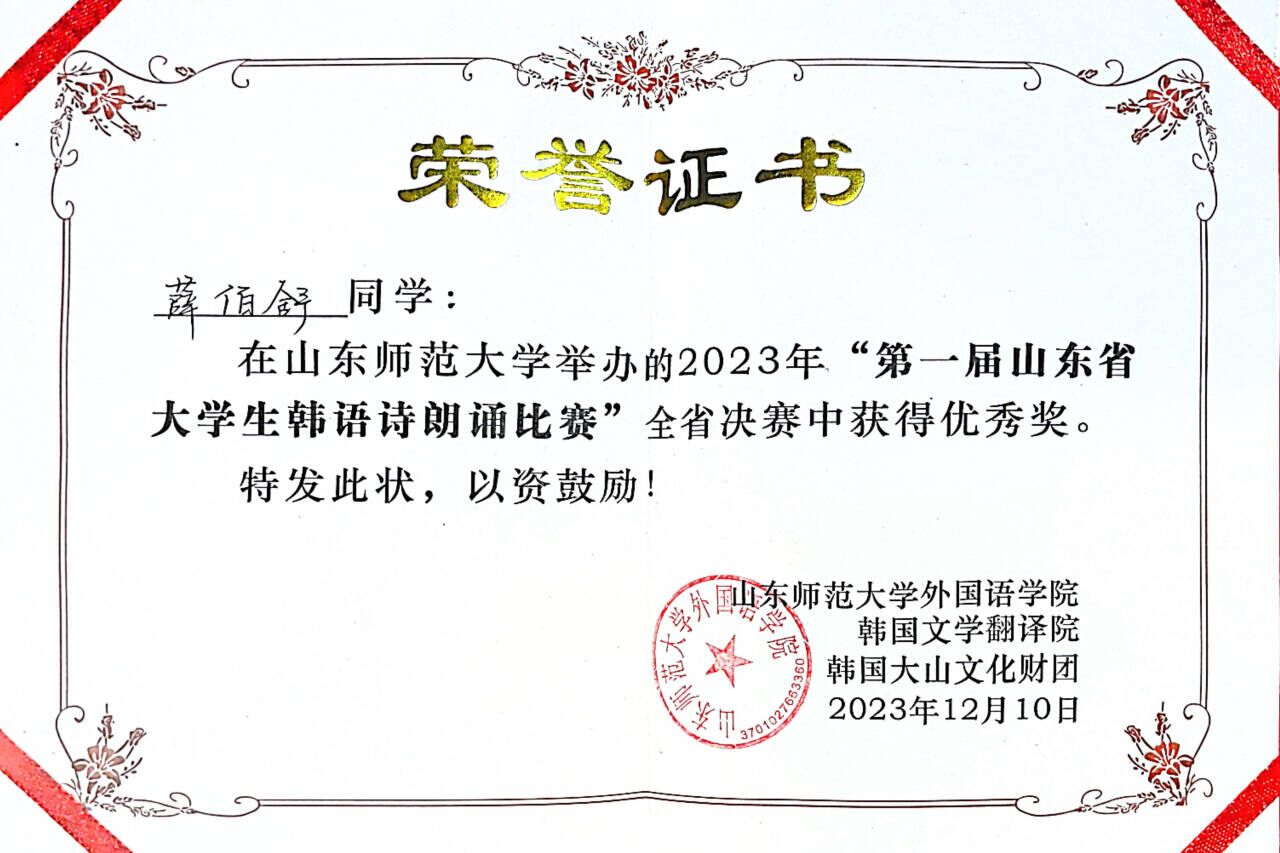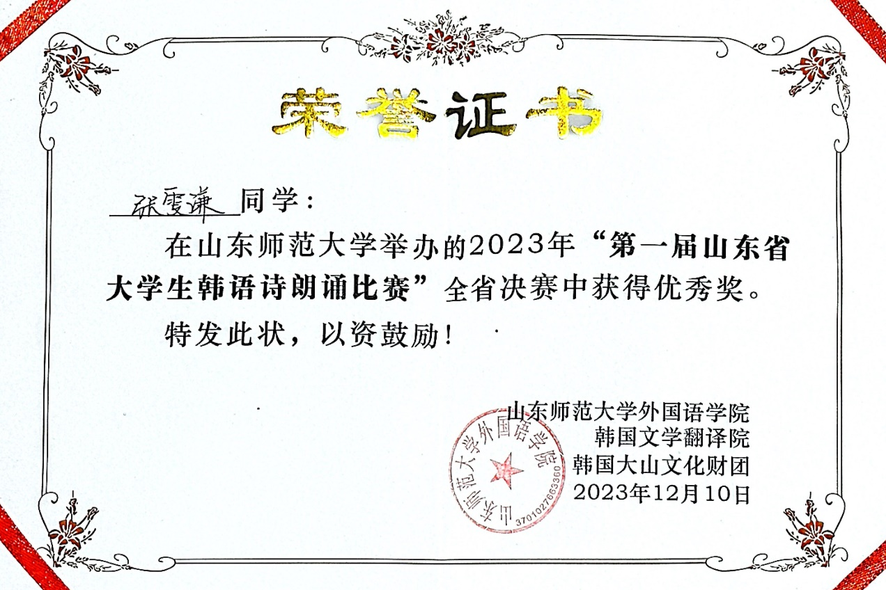韩语系教师仲维芳指导的薛佰舒及韩语系教师吴纯指导的张雯谦,在第一届山东省大学生韩语诗朗诵比赛中声情并茂、细腻婉转地朗诵相应篇目,节奏张弛有力,语调起伏变化,讲解深刻扼要,展现了优秀的语言表达能力和诗歌鉴赏能力,最终荣获优秀奖。
