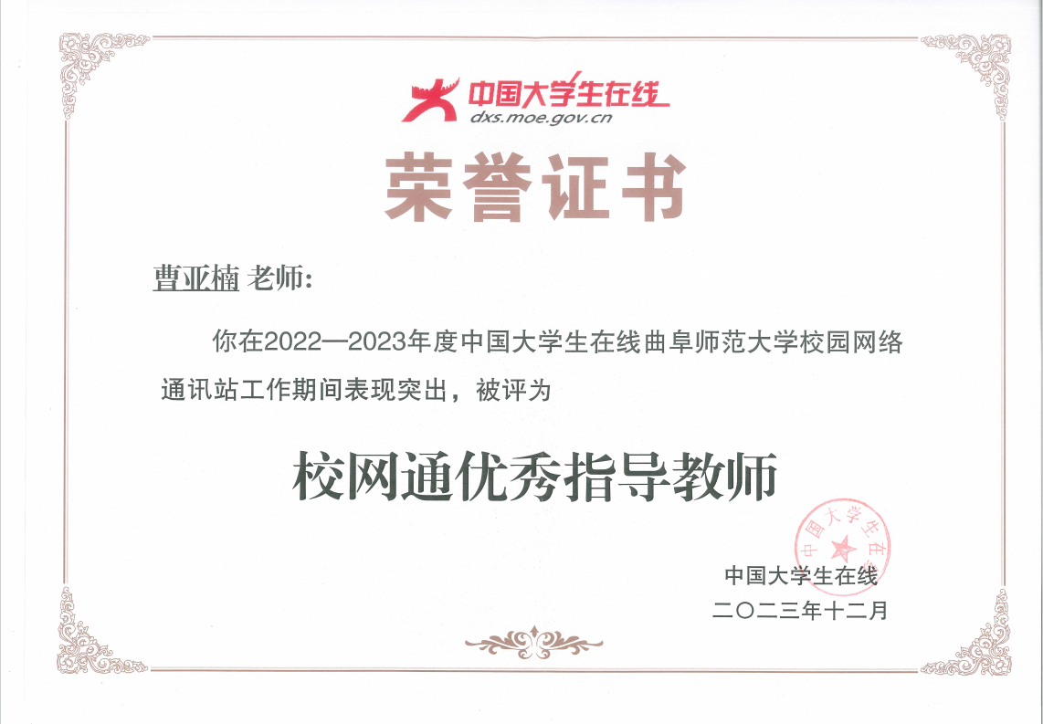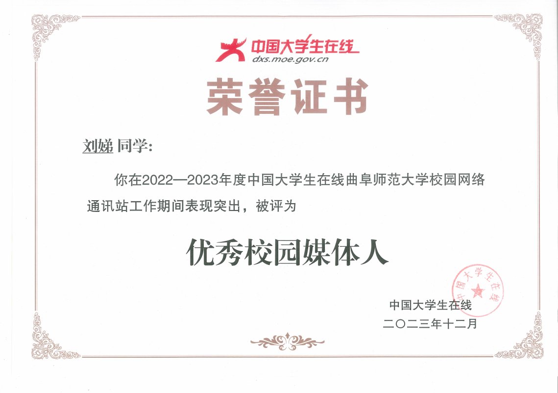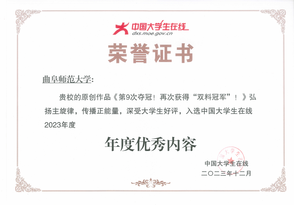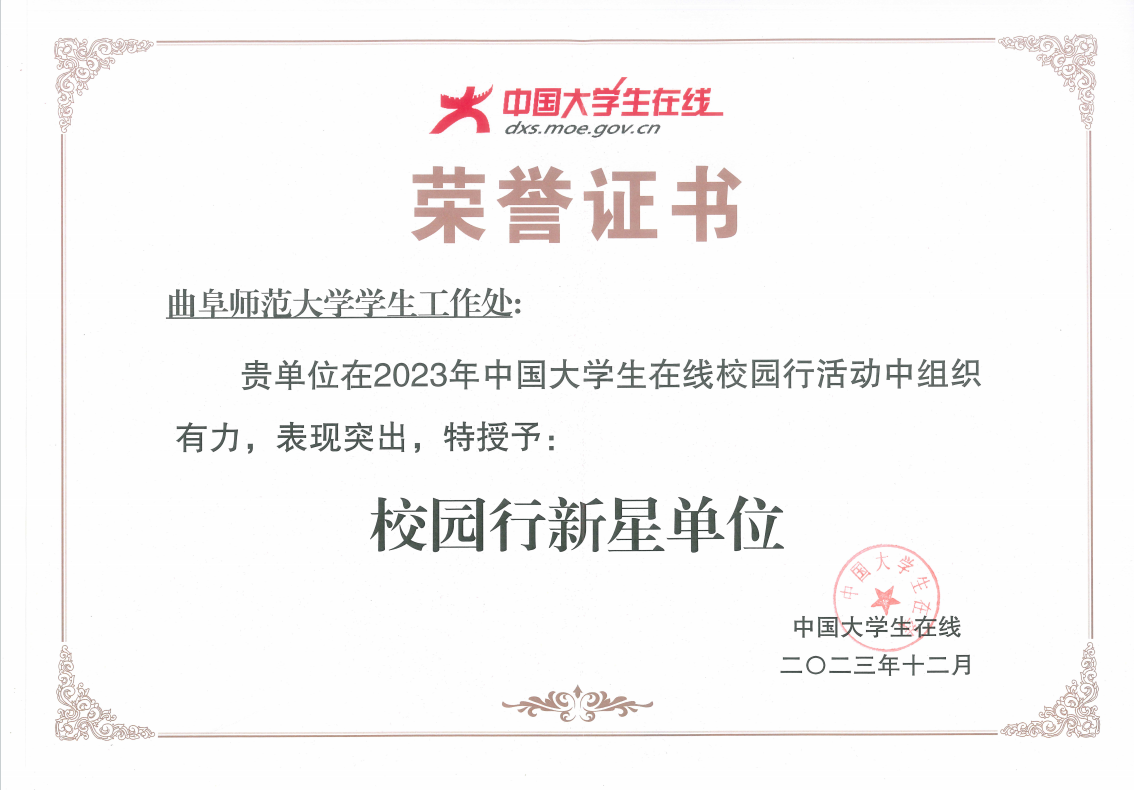 曲阜师大学生工作处讯 近日,中国大学生在线平台发布了《中国大学生在线校网通及校园行活动2023年度表彰名单》,曲阜师大获得多项荣誉。曲阜师大中国大学生在线网通站——完美体育(中国)官方网站学工在线获“优秀校网通站”称号,曲阜师大学生工作处获“校园行新星单位”称号,原创作品《第9次夺冠!再次获得“双料冠军”!》获评“年度优秀内容”,学生工作处曹亚楠老师获“校网通优秀指导教师”称号,心理学院学生、曲阜师大中国大学生在线校网通站站长刘娣获“优秀校园媒体人”称号。
