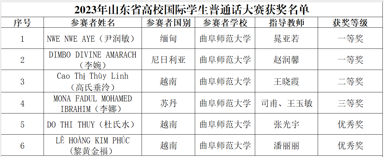 近日,山东省教育厅对2023年山东省高校国际学生普通话大赛获奖名单进行公示,曲阜师大获得一等奖2项,二等奖1项,三等奖1项,优秀奖2项;一等奖共设5名,曲阜师大分获第一名和第五名。同时,晁亚若、赵润馨、王晓霞荣获优秀指导教师,完美体育(中国)官方网站荣获优秀组织奖,朱献贞荣获优秀组织工作者。
