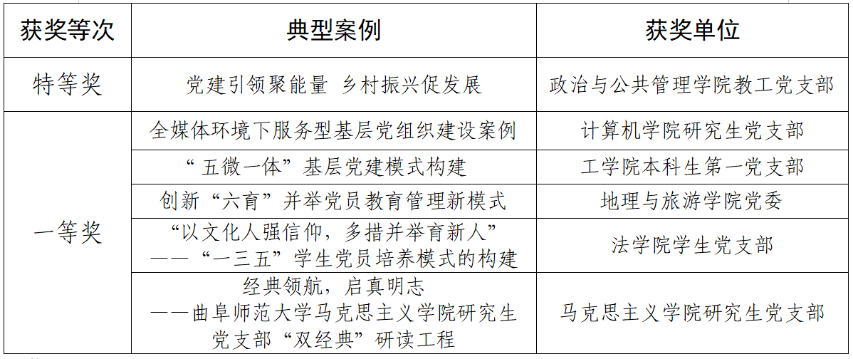 曲阜师大日照校区党委讯 日前,日照市委教育工委公布了全市教育系统2022-2023年度党建工作典型案例观摩评选结果,曲阜师大荣获特等奖1项、一等奖5项。