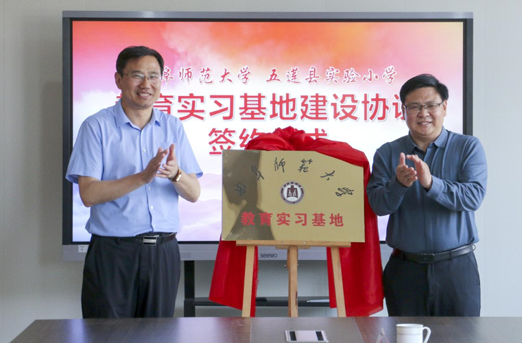 张明洁分别与济宁一中任城校区执行校长房晓辉、五莲县实验小学校长陈祥权、五莲中学校长魏本福签订“完美体育(中国)官方网站学生实习基地”协议。张明洁、李光顺与各学校校长共同为基地揭牌。