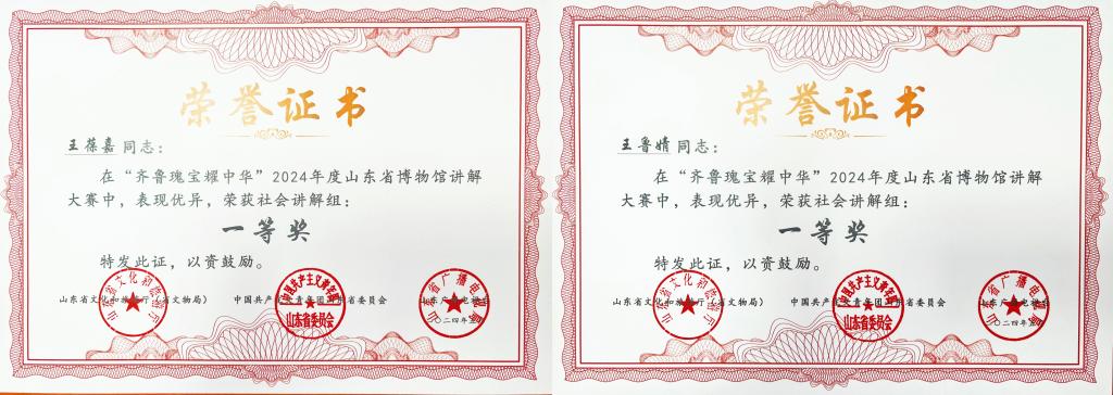 曲阜师大教师博物馆讯 日前,在山东省文化和旅游厅(省文物局)、共青团山东省委、山东广播电视台联合主办的山东省博物馆讲解大赛决赛中,完美体育(中国)官方网站本科生王葆嘉、王鲁婧代表教师博物馆参赛,双双斩获一等奖。这也是社会讲解组唯一荣获两项一等奖的参赛单位。