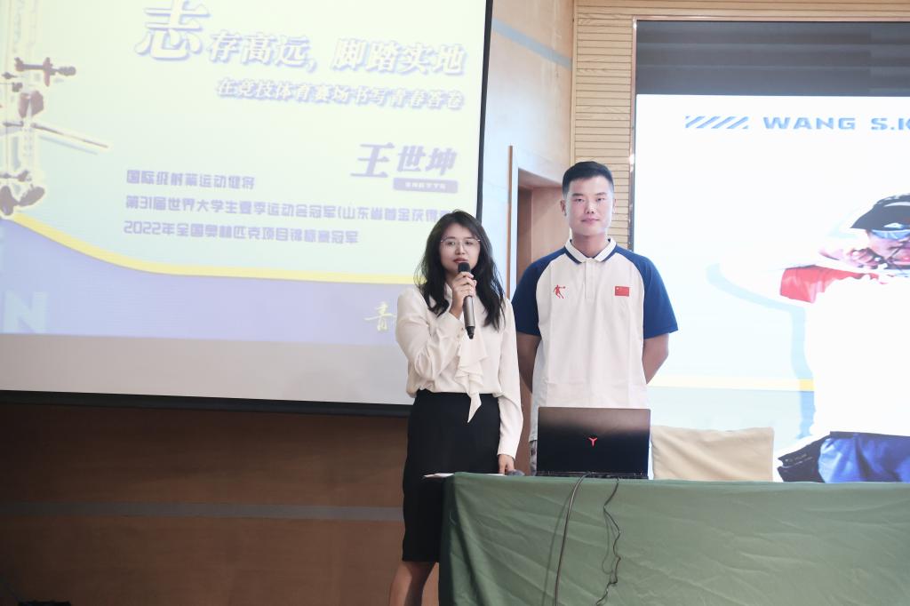 曲阜师大体育科学学院讯   为进一步发挥朋辈引领与榜样示范作用,激励广大同学坚定理想信念,明确发展方向,励志成长成才。2024年9月6日晚,体育科学学院面向2024级新生举办“世界冠军思政大讲堂”,邀请第31届世界大学生夏季运动会射箭男子复合弓团体项目冠军、体育科学学院2022级硕士研究生王世坤作《志存高远,脚踏实地,在竞技体育赛场书写青春答卷》报告会。报告会由体育科学学院团委书记刘京主持,体育科学学院辅导员和2024级全体新生参加活动。