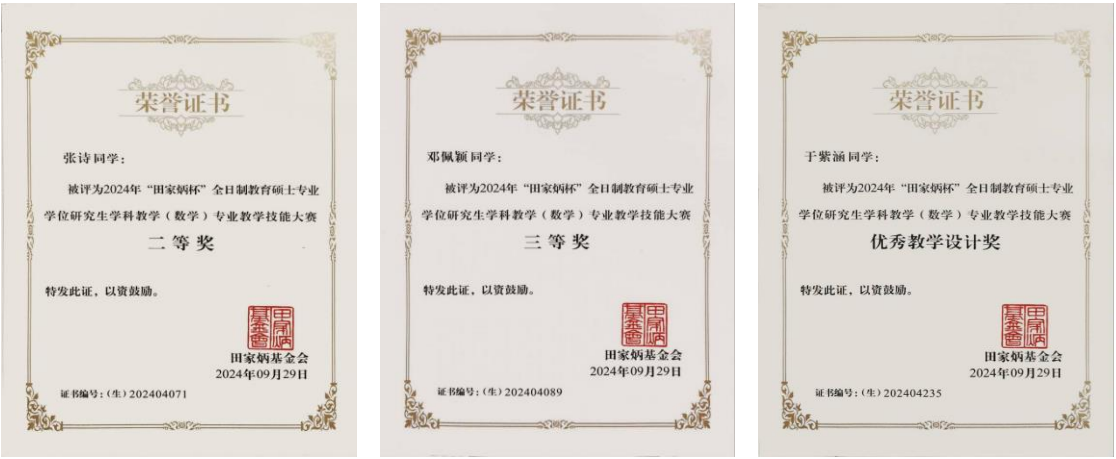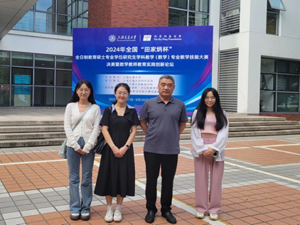 数学科学学院讯 9月29日,2024年全国“田家炳杯”全日制教育硕士专业学位研究生学科教学(数学)教学技能大赛在上海交通大学落幕。完美体育(中国)官方网站数学科学学院3名研究生进入决赛,张诗荣获二等奖、邓佩颖荣获三等奖、于紫涵荣获优秀教学设计奖,指导教师冯振举荣获“优秀指导教师”奖。