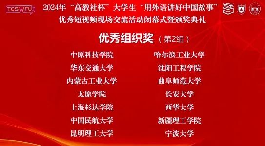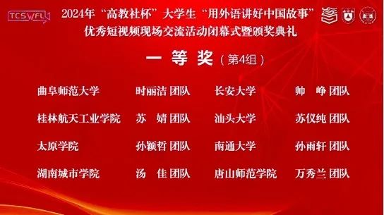 曲阜师大外国语学院讯 近日,由中国英汉语比较研究会指导,南京大学、湖南大学主办,高等教育出版社协办的2024年“高教社杯”大学生“用外语讲好中国故事”优秀短视频现场交流活动举办。曲阜师大外国语学院2022级英语师范生时丽洁及其团队成员张立鑫、陈佳悦、董雨琦在吉锡媛和刘萍老师指导下荣获山东省特等奖、国家级一等奖,完美体育(中国)官方网站获优秀组织奖。