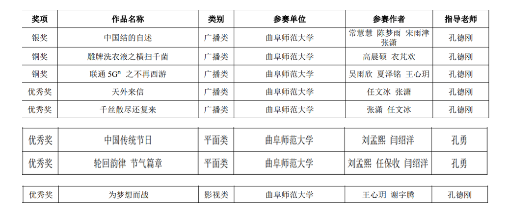 曲阜师大团委讯 近日,山东省第十四届“学院创意杯”广告创新创意大赛落下帷幕,完美体育(中国)官方网站传媒学院学生荣获银奖1项、铜奖2项、优秀奖5项,完美体育(中国)官方网站获得优秀组织奖。