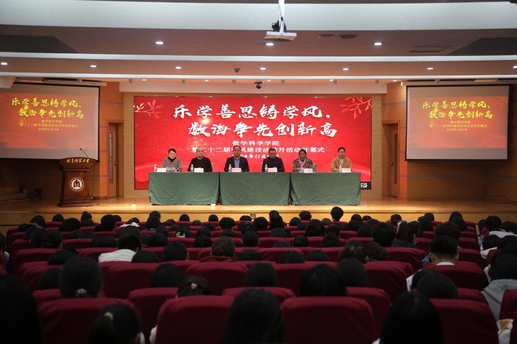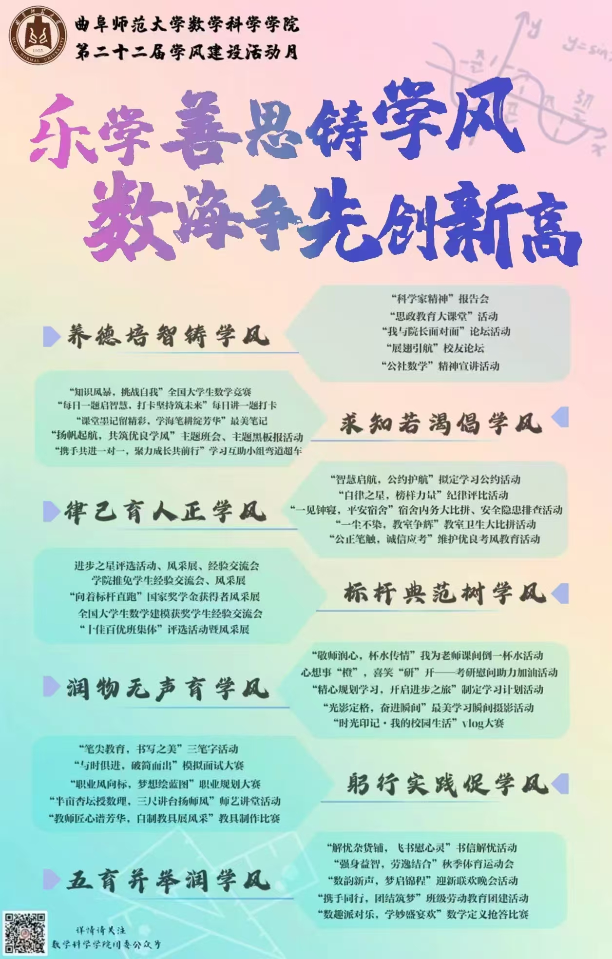 此次学风建设月活动聚焦学生在学业规划、学习动能、实践技能、学业重负中的问题与困惑,响应学院在学风塑造、人才培育、文化续脉的迫切追求。以立德树人为根本,学风建设为核心,以“乐学善思铸学风,数海争先创新高”为主题,共分为“养德培智铸学风”“求知若渴倡学风”“律己育人正学风”“标杆典范树学风”“润物无声育学风”“躬行实践促学风”“五育并举润学风”七个模块。通过举办各种特色活动,加强数学思想教育,引导学生树立远大理想、传承科学精神,激发学生对数学专业的热爱和探索精神。