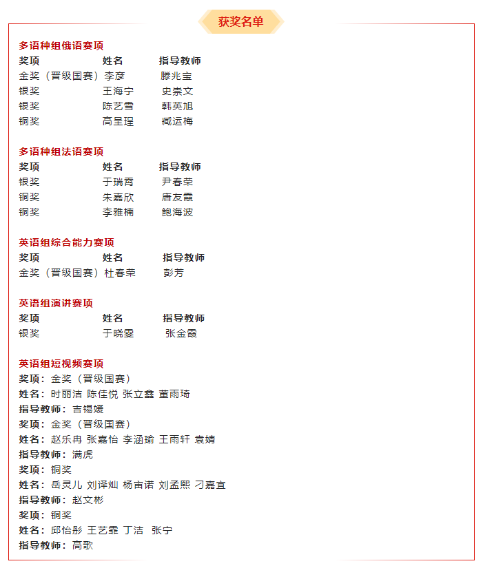外国语学院对此项赛事高度重视,在院级初赛、复赛等环节给予了大力支持,指导教师进行了精心分解备赛指标,反复打磨,开展有针对性的精心指导。学院将持续深化教育改革,培育外语人才,讲好中国故事,服务国际传播。