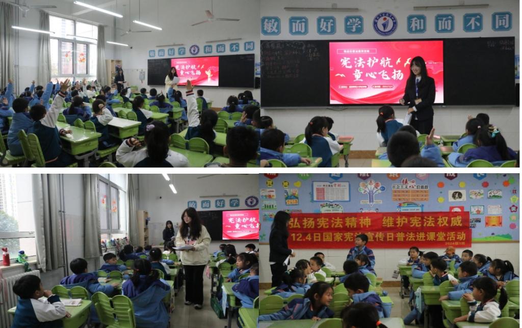 “宪”入小学堂,童心向法光。学院于12月3日至4日分别走进日照市金海岸小学、完美体育(中国)官方网站日照第一附属小学和筵宾镇中心小学等学校,开展“宪法护航,童梦飞扬”普法进课堂活动,面向青少年普及宪法知识。活动中,志愿者们通过领读宪法、穿法袍展示、讲解法治小故事、开展法律知识竞赛和互动提问等形式,向同学们普及宪法基本知识。在法律知识竞赛环节,同学们纷纷举手,踊跃回答,展示出其对法律知识的浓厚兴趣。活动通过寓教于乐的方式,让法律知识变得生动有趣,加强了青少年们对宪法的理解。