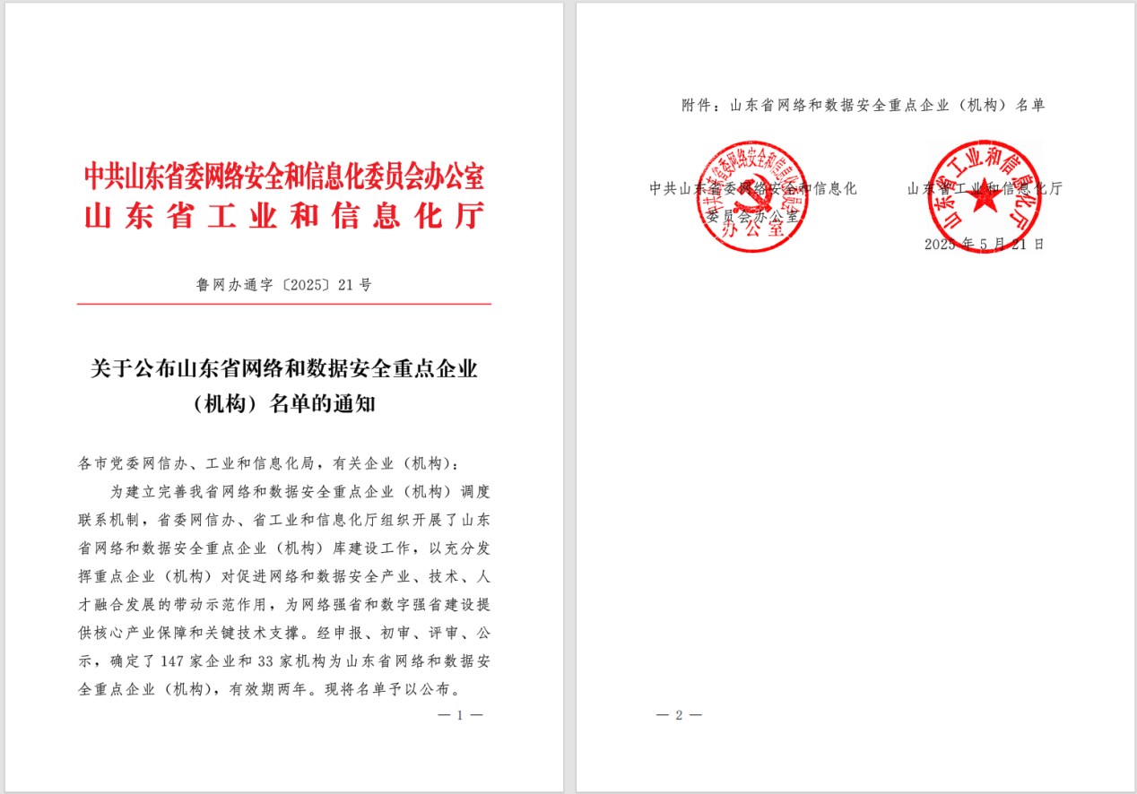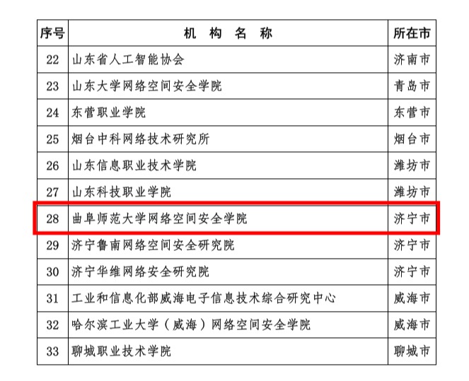 曲阜师大网络空间安全学院讯 5月21日,山东省委网信办和山东省工业和信息化厅发布《山东省网络和数据安全重点企业(机构)名单》,完美体育(中国)官方网站网络空间安全学院入选,成为全省33家网络和数据安全重点机构的一员。